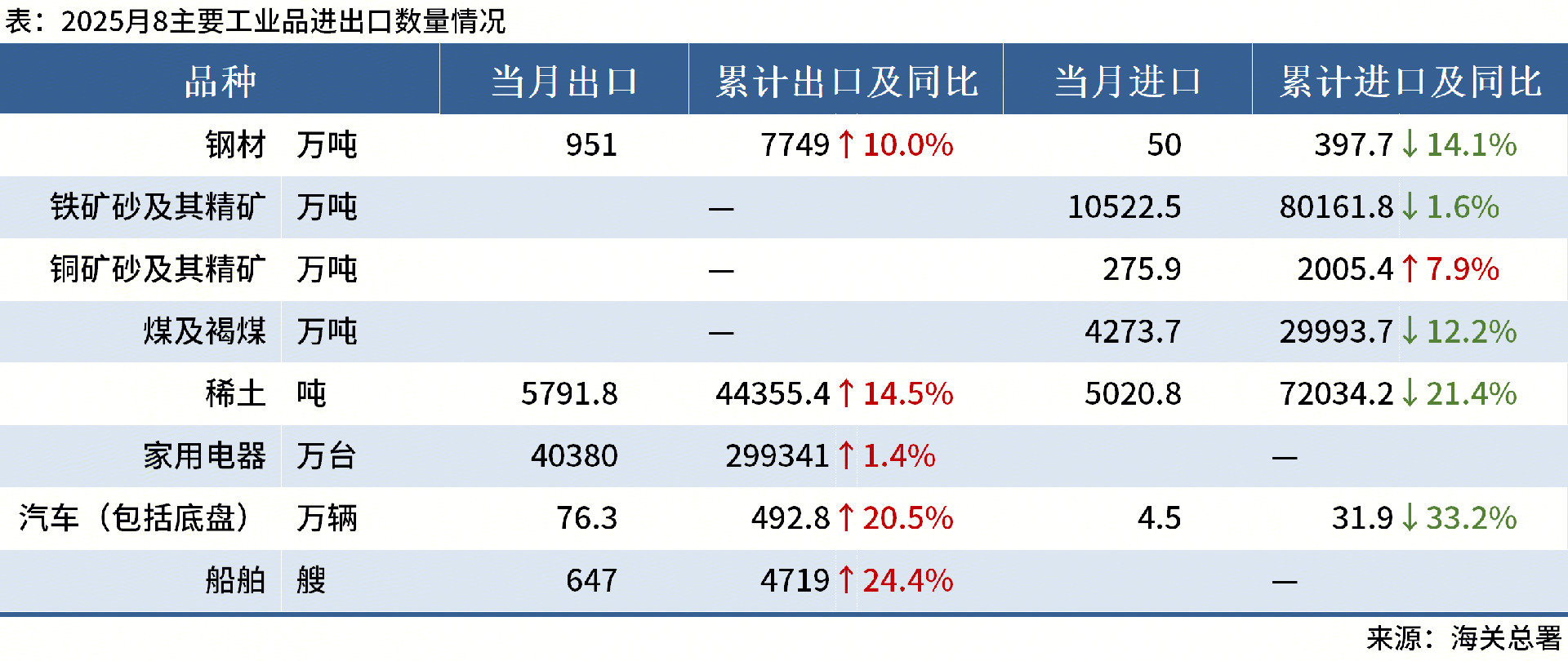 ◎海關(guān)總署數(shù)據(jù)顯示,8月中國出口鋼材951.0萬噸,較上月減少32.6萬噸,環(huán)比下降3.3%;1-8月累計出口鋼材7749.0萬噸,同比增長10%。其他主要工業(yè)品進出口情況如下: