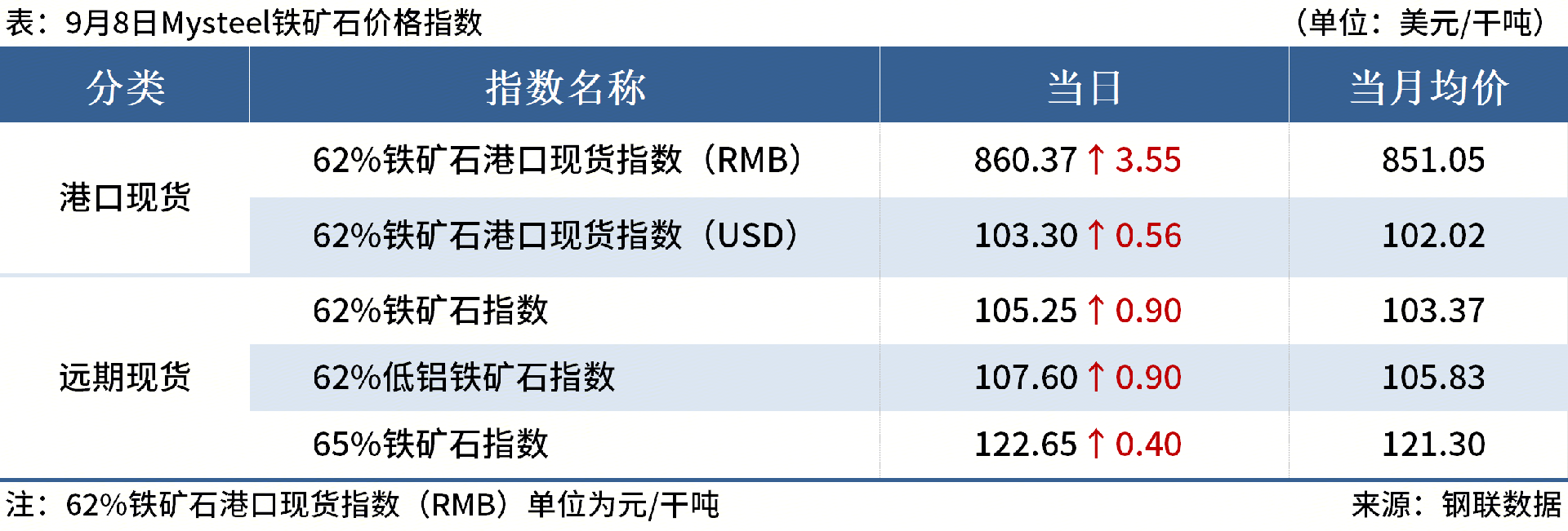 ◎9月8日Mysteel進口鐵礦石62%澳洲粉礦遠期現(xiàn)貨指數(shù)105.25,漲0.9,月均103.37;65%巴西粉礦遠期現(xiàn)貨指數(shù)122.65,漲0.4,月均121.3。(單位:美元/干噸)