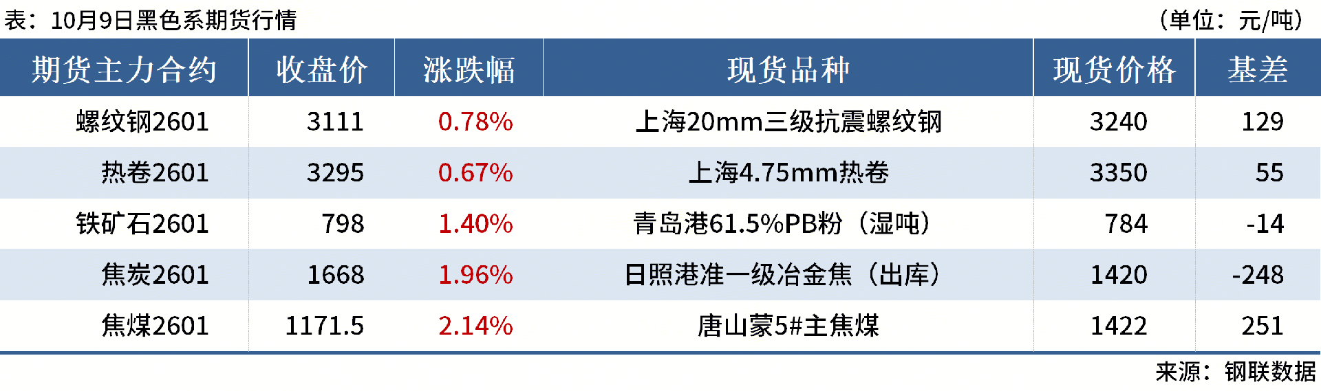 ◎10月9日,全國主港鐵礦石成交98.00萬噸,環(huán)比增397.5%;237家主流貿(mào)易商建筑鋼材成交11.99萬噸,環(huán)比增49%。