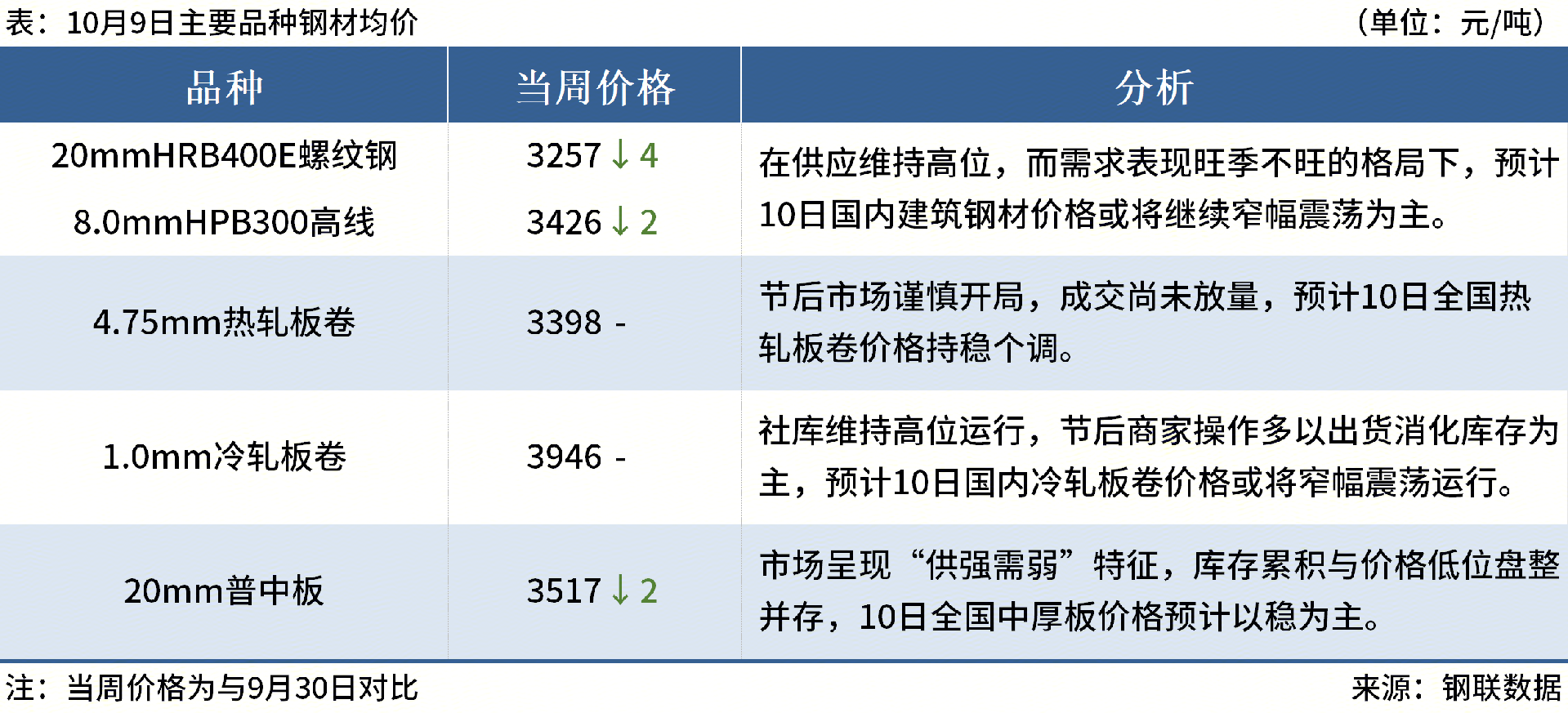 ◎10月9日,76家獨(dú)立電弧爐建筑鋼材鋼廠平均成本為3314元/噸,環(huán)比節(jié)前減少2元/噸,平均利潤虧損147元/噸,谷電利潤虧損49元/噸。