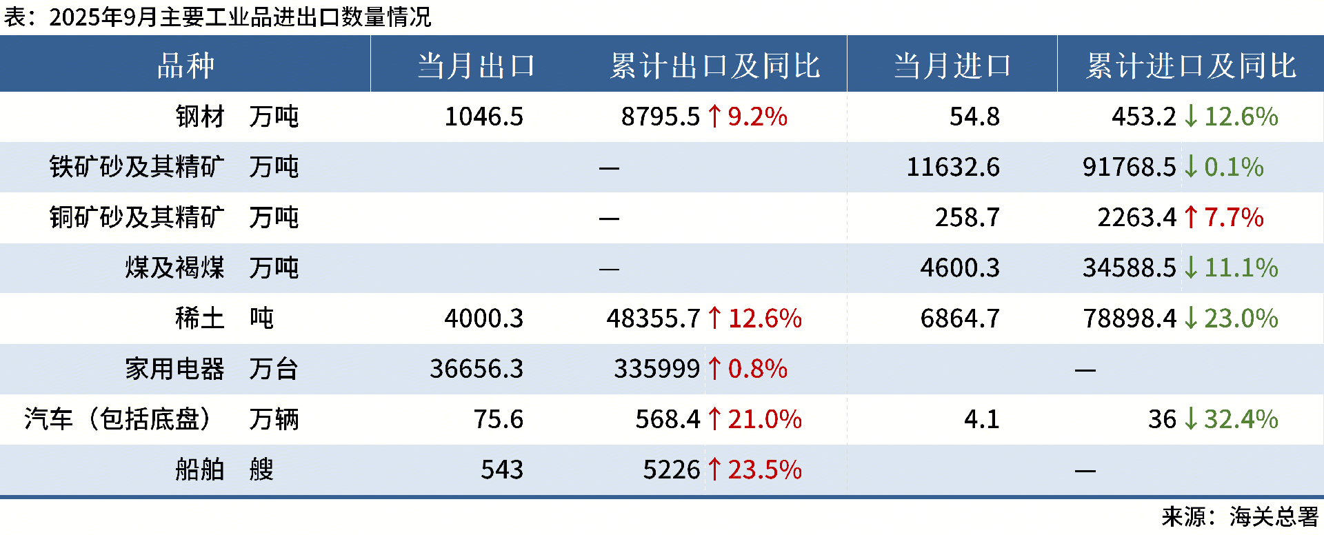 ◎ 海關總署:9月中國出口鋼材1046.5萬噸;1-9月累計出口鋼材8795.5萬噸,同比增長9.2%。其他主要工業(yè)品進出口情況如下: