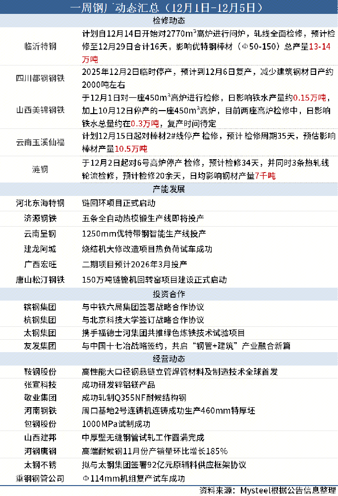 據(jù)Mysteel不完全統(tǒng)計(jì),本周(12月1日-12月5日)5家鋼廠發(fā)布檢修信息,具體如下: